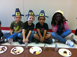 The whole first grade participated in a re-enactment of the First Thanksgiving. Half of us acted as Indians, and half as pilgrims.